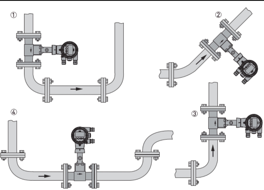 Đối với các ứng dụng khí/hơi nước, đường ống luôn đầy khí. Do đó, lưu lượng kế có thể được lắp đặt theo hướng dòng chảy thẳng đứng đi lên, dòng chảy thẳng đứng hướng xuống hoặc hướng ngang. Tuy nhiên, nó không được cài đặt ở những điểm thấp. Các vị trí lắp đặt được đề xuất là: