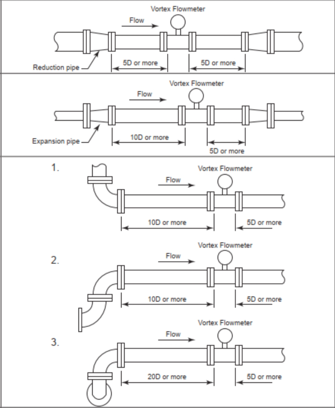 3. Các phần ống thẳng ở thượng nguồn và hạ lưu (nếu cần có dụng cụ đo nhiệt độ và áp suất thì phải lắp đặt ở phía hạ lưu của lưu lượng kế. Các dụng cụ ở hạ lưu cũng phải được đặt bên ngoài phần ống thẳng. Thứ tự bố trí khuyến nghị cho nhiều dụng cụ là: lưu lượng kế, máy phát áp suất, máy phát nhiệt độ). Nói chung, hãy tham khảo các yêu cầu về chiều dài ống thẳng được chỉ định trong mẫu sản phẩm của nhà sản xuất (hoặc hướng dẫn chung về 15D ngược dòng và 5D xuôi dòng theo hướng dẫn sử dụng thiết bị). Thông báo trước cho nhóm kỹ thuật đường ống về các yêu cầu về đường ống thẳng thượng nguồn và hạ lưu đối với lưu lượng kế xoáy. Sau khi chọn nhà sản xuất thiết bị, các yêu cầu lắp đặt phải được xác nhận lại theo thông số kỹ thuật của nhà sản xuất.